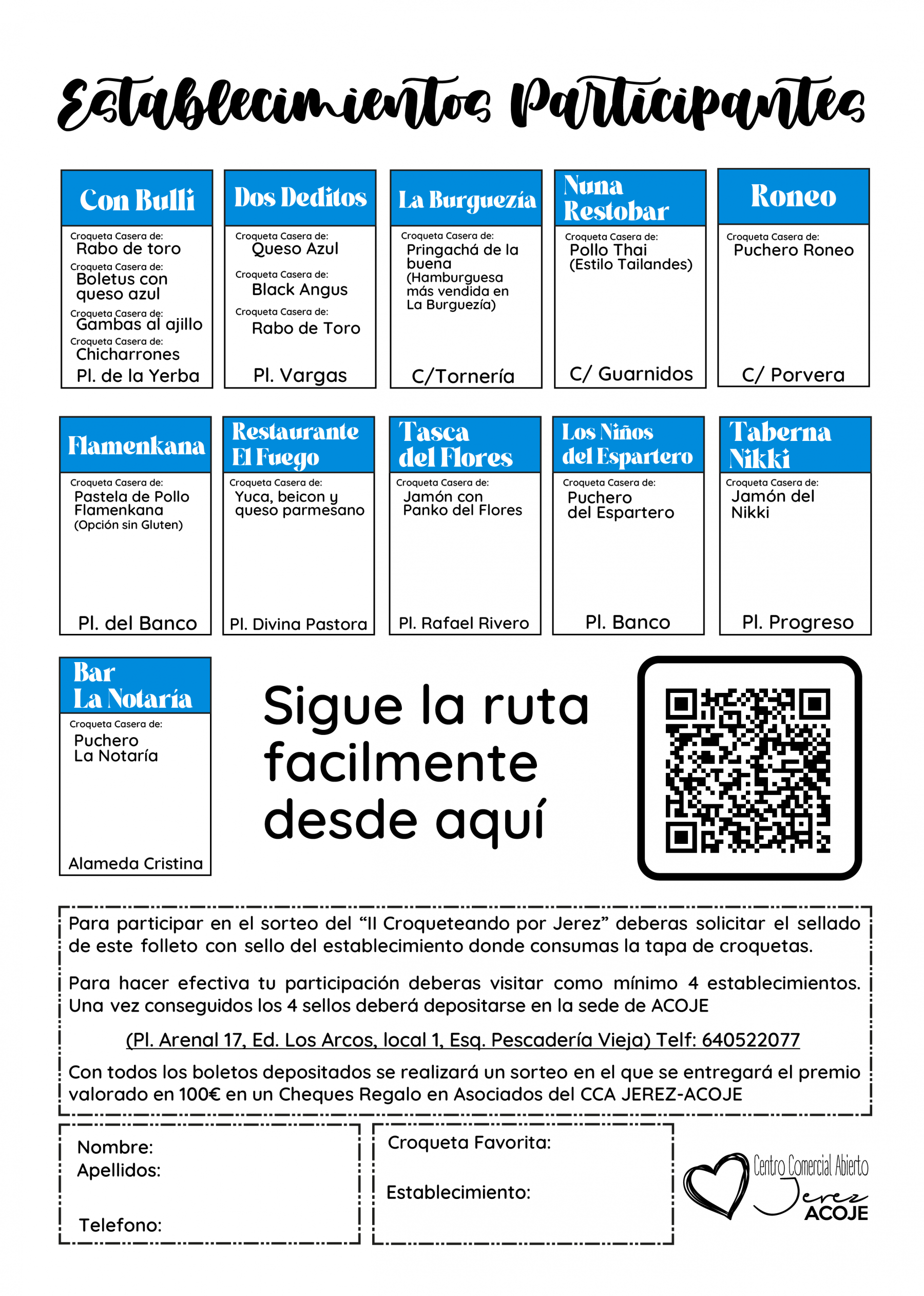 Para hacer aún más divertida la experiencia, los participantes podrán participar del sorteo del 'II Croqueteando por Jerez'. Para ello, deberán visitar al menos cuatro establecimientos, solicitar el sello de participación en el folleto de la ruta y depositarlo en la sede de Acoje (Plaza Arenal, Edificio Los Arcos, Local 1). Entre todos los participantes se sorteará un premio valorado en 100 euros en cheques regalo, para canjear en comercios asociados al CCA Jerez-Acoje.