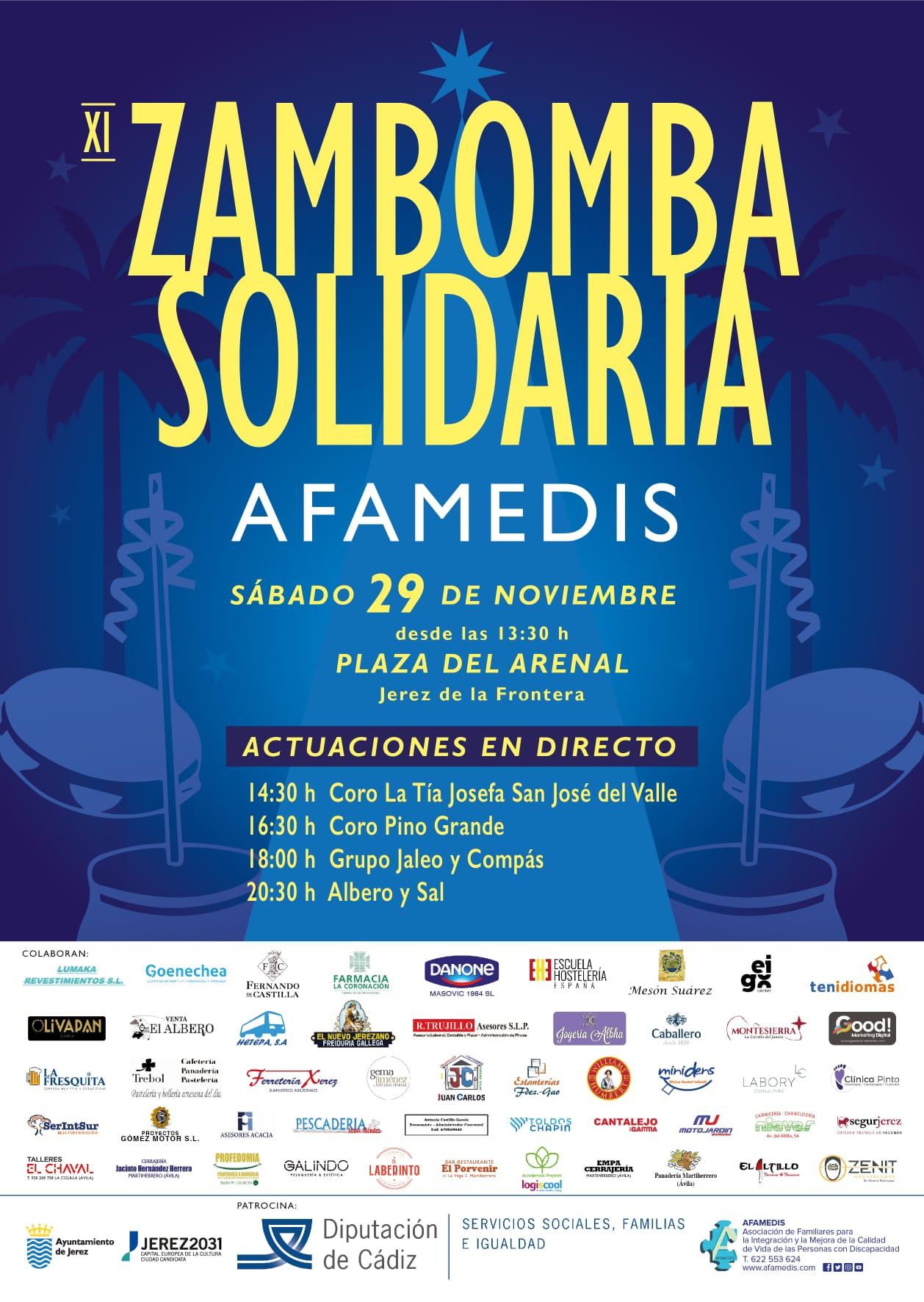 La zambomba de Afamedis comenzará a partir de las 13:30 horas, y contará durante toda la tarde con las actuaciones del Coro La Tía Josefa de San José del Valle, el Coro Pino Grande, el Grupo Jaleo y Compás, y Albero y Sal. Afamedis tendrá a la venta en esta zambomba su Calendario Solidario, editado también con la finalidad de recaudar donativos destinados a los servicios que ofrece la entidad.